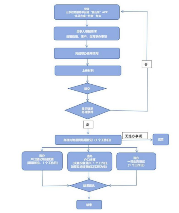 (一)線上辦理。當事人可以直接通過登錄山東政務服務平臺(http://www.shandong.gov.cn/col/col94091/)“高效辦成一件事”專區或登錄“愛山東”APP 平臺“高效辦成一件事”專區進入“結婚落戶一件事”主題集成服務模塊,進行結婚登記網上預約和戶口登記項目變更(婚姻狀況)、戶口遷移(夫妻投靠落戶)、生育登記的在線申請。